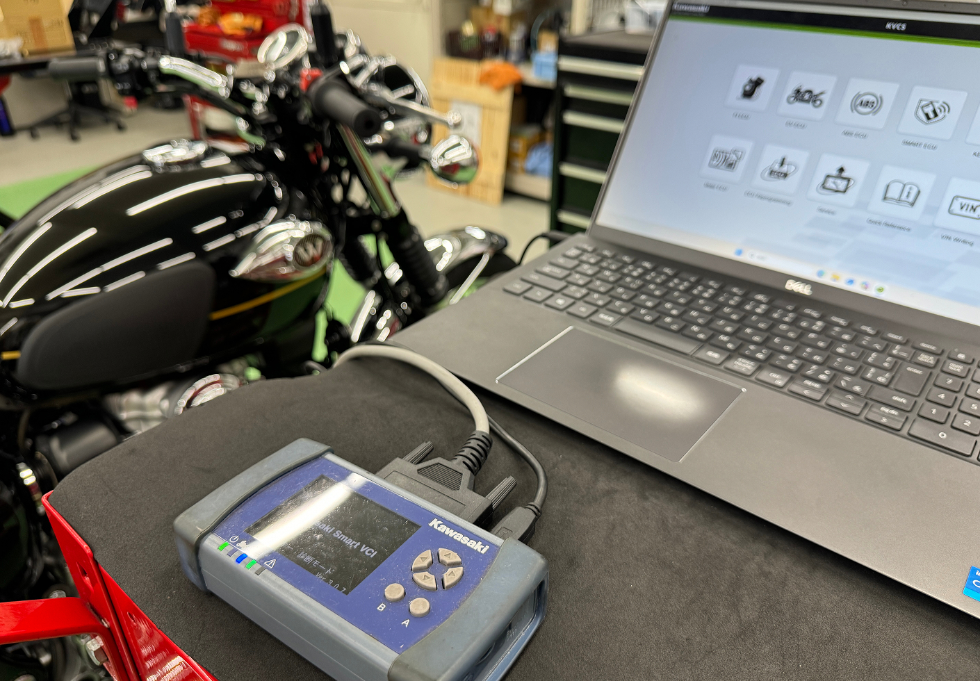 KVCS(Kawasaki Vehicle Communication System)は、カワサキ車専用の診断機を使用し、お客様がお持ちのモーターサイクルの状態を的確に把握し、最適なメンテナンスを提供するための専用診断機です。