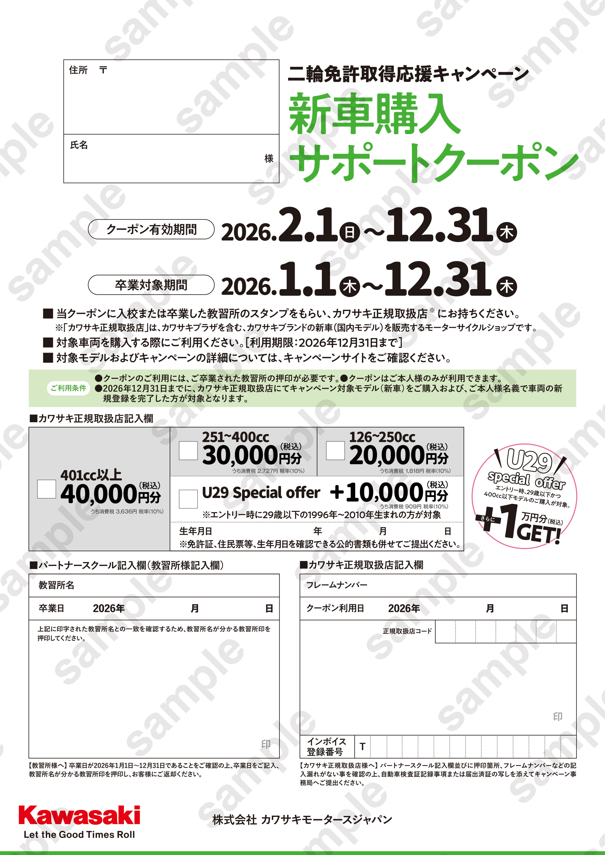 二輪免許取得応援キャンペーン 最大4万円(税込)分GET! エントリー期間 第1弾 2026.2.1(日) 〜 6.30(火) 第2弾 2026.7.1(水) 〜 10.31(土)  キャンペーン対象となる卒業期間:2026.1.1(木)〜12.31(木) 新車購入サポートクーポン有効期間:2026.2.1(日)〜12.31(木) U29 special offer エントリー時、29歳以下かつ400cc以下モデルのご購入が対象。 さらに1万円分(税込)GET! 免許取ったら、どれに乗る?